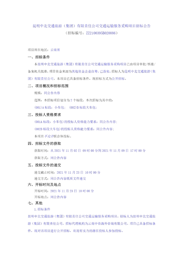 昆明中北交通旅游(集团)有限责任公司交通运输服务采购项目招标公告