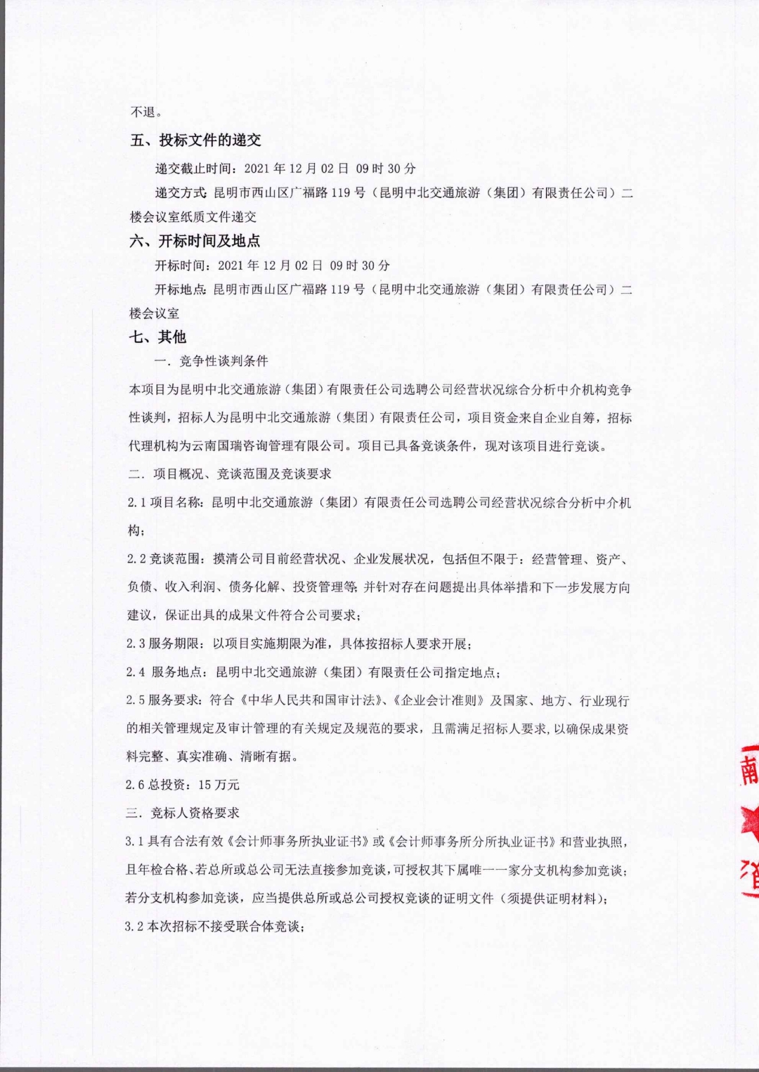 昆明中北交通旅游(集团)有限责任公司选聘公司经营状况综合分析中介机构竞争性谈判公告