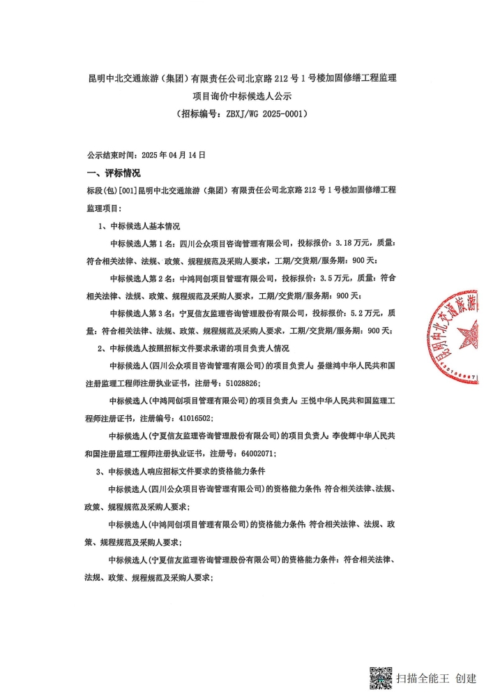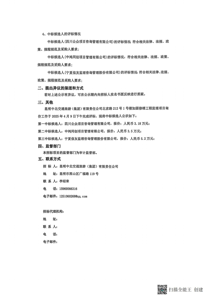 昆明中北交通旅游(集团)有限责任公司北京路212号1号楼加固修缮工程监理项目询价中标侯选人公示